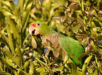 "O gênero Amazona inclui doze espécies de papagaios que ocorrem no Brasil, sendo que quatro estão em estado vulnerável ou ameaçados de extinção, entre eles o papagaio-de-peito-roxo (Amazona vinacea). A